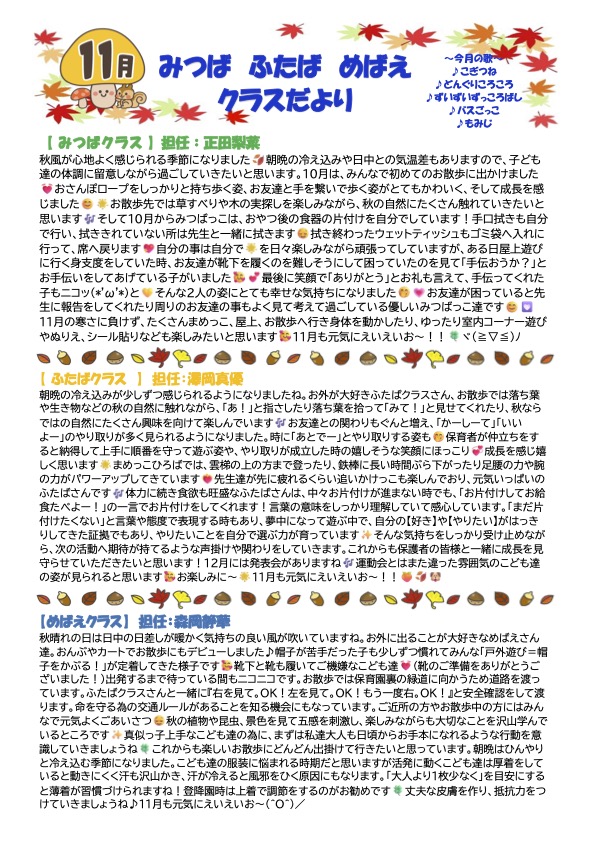 クラスだより みつば・ふたば・めばえクラスだより(11月号) 2025.11.01 2025.11.04 よつばA・B・Cクラスだより(11月号) 前の記事 まめっこ保健だより(11月号) 次の記事 新着のお知らせ まめっこ保健だより(11月号) 2025.11.01 よつばA・B・Cクラスだより(11月号) 2025.11.01 園だより(11月号) 2025.11.01