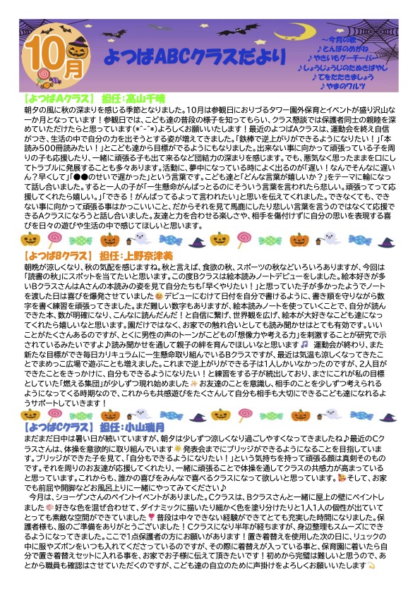 クラスだより よつばA・B・Cクラスだより(10月号) 2025.10.01 2025.11.04 園だより(10月号) 前の記事 みつば・ふたば・めばえクラスだより(10月号) 次の記事 新着のお知らせ まめっこ保健だより(11月号) 2025.11.01 みつば・ふたば・めばえクラスだより(11月号) 2025.11.01 よつばA・B・Cクラスだより(11月号) 2025.11.01